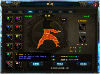 - 玩家可自由选择部位进行灌注、升级炼体等级