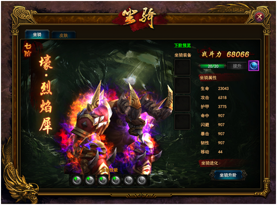 - 坐骑升阶界面:玩家可为坐骑升阶、穿戴装备、升级坐骑技能、喂养坐骑资质丹