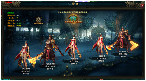 - 点击主界面右上方比比武场按钮时,弹出比武场界面。如下图1-1