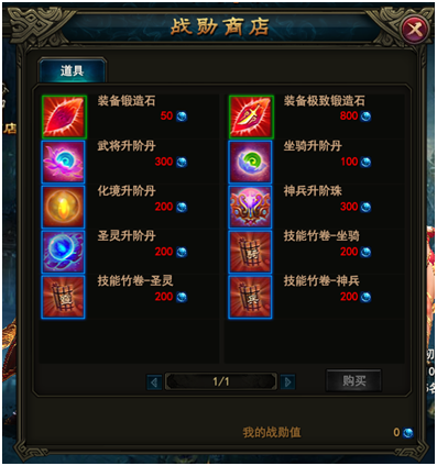 - 战勋可通过比武场界面中的战勋商店进行兑换稀有道具,如下图1-3