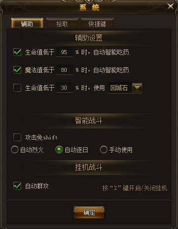 点击右上角的辅助按钮,即可进入挂机设置界面。