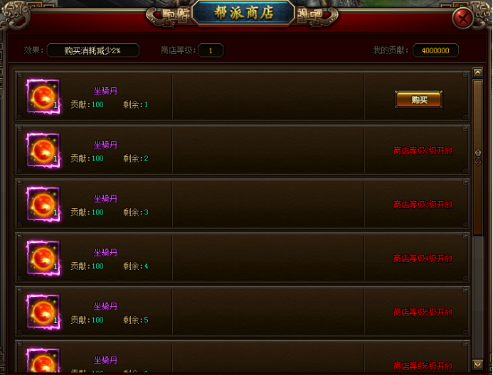 帮会商城:玩家可通过消耗贡献值购买所需道具