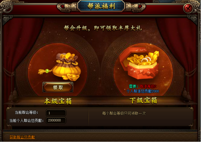 帮派福利:每天领取帮会奖励的地方,帮派等级越高,奖励越丰厚。
