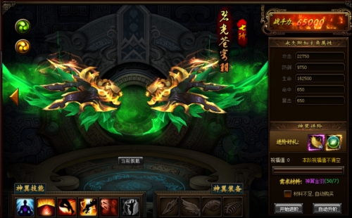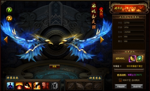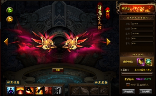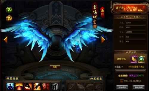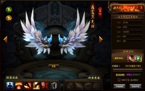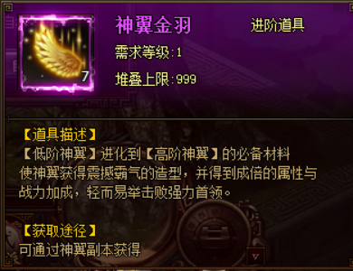 玩家获得神翼后可以通过使用“神翼金羽”提升神翼等阶,神翼等阶越高神翼的外观越炫酷、神翼提供的属性也就越高。极大的提升玩家战斗力。