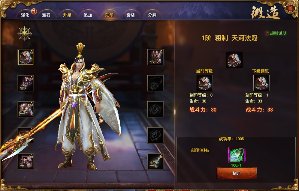 消耗【刻印石】即可对装备进行各装备的属性增加。温馨小提示,刻印只能针对5阶及以上的封天品质的装备进行。