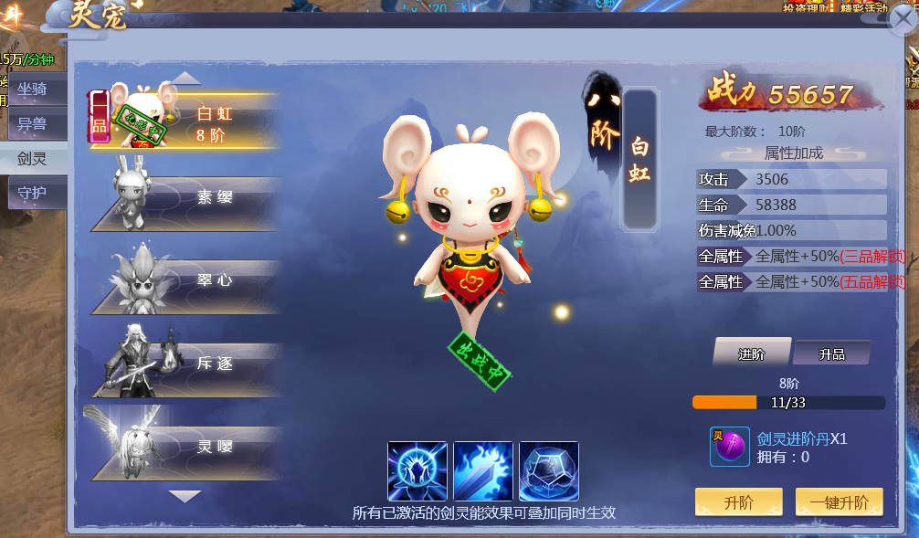 ●升阶属性:玩家可消耗升阶材料来升阶剑灵获得属性加成