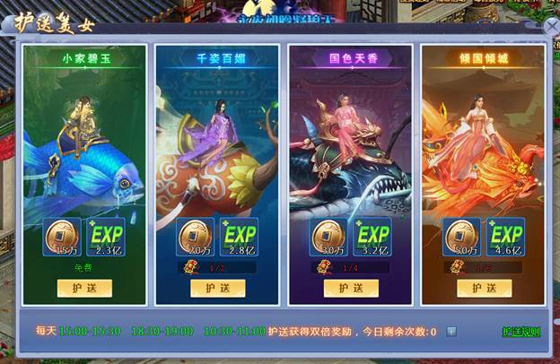 护送是全天开启的活动,玩家可在护送npc处接取护送任务,在时限内将美人送到目的地即可获得奖励。护送全天可进行,每天可进行3次,但是每天16:00-16:30和21:00-21:30开启护送双倍活动,玩家在该时间段护送可获得双倍奖励。