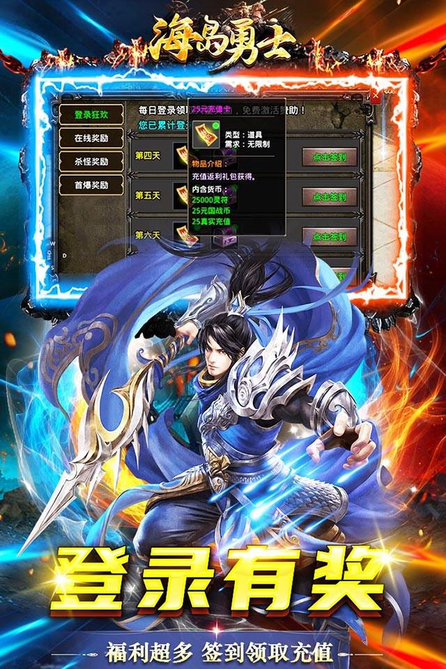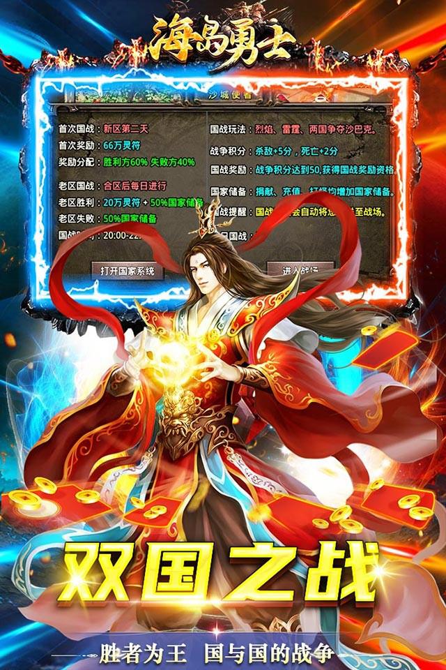 《海岛勇士(国战狂爆打金)》是一款以国战为主题的单职业传奇手游,用两个国家代替了行会制度,玩法新颖,激情更胜!上线就能领取各种特殊物品,更加高效持续打金,满级VIP都是做任务获取,挂机自带全屏吸怪,每天限时活动都是激情满满,千万不要错过。各种福利领不停,快来带领你的将士攻下对方王都,你将会是下个一国之君!