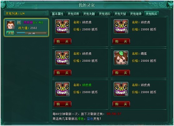 灵宠可以在商城购买,也可以在灵宠面板上购买,商城里可以直接买到紫色资质的斗战圣猴,灵宠面板上可以买到萌狐、萝卜兔,和顽皮虎。一般在面板上只能买到白色资质灵宠,每60分钟刷新一次,有几率购买到绿色和蓝色的灵宠。