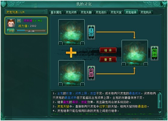 主宠继承后在形象,资质上限,类型上变,成长取两只灵宠的最高值,资质也取最高值但不能超出主宠资质上限。主宠的洗髓值保持不变。