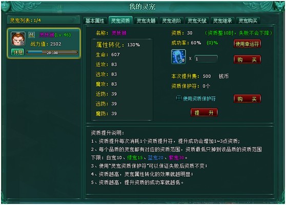 灵宠资质的高低直接决定转给人物属性的高低。灵宠资质分为白,绿,蓝,紫四个种类。每一个等级有一定的范围可以提升。