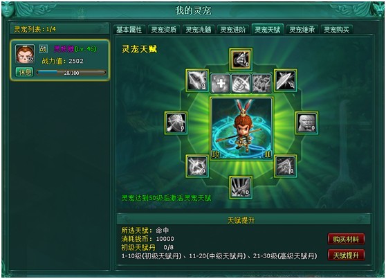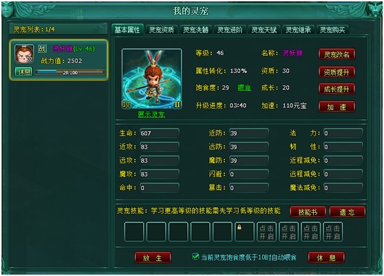 打开面板后,首先显示的是灵宠基本属性,灵宠的等级,属性转化,饱食度等,如果饱食度太低就要给灵宠喂食。灵宠的升级速度可以用元宝加速。等级越高需要的元宝越多。