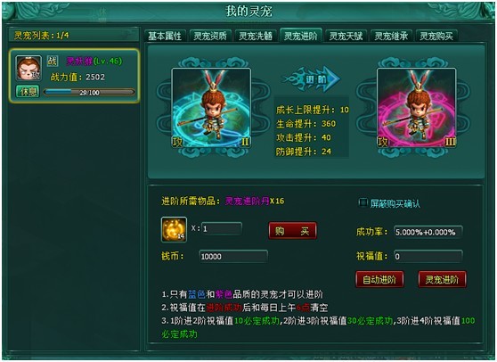灵宠进阶需要进阶丹,只有蓝色和紫色的灵宠可以进阶,进阶后灵宠的各项属性有大幅度的增强。