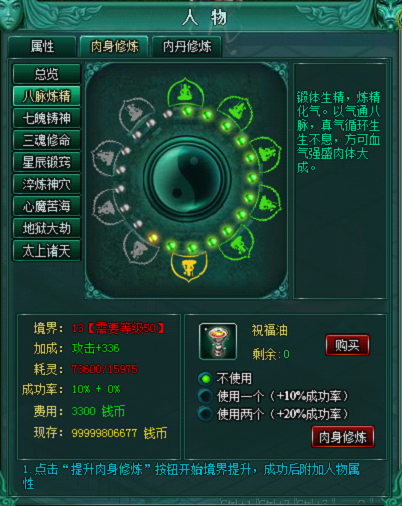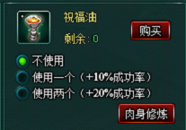 注:使用“祝福油”可以提高5%的成功率,最多可以使用两个。“祝福油”可在商城中购买,诛妖有一定概率可以获得。