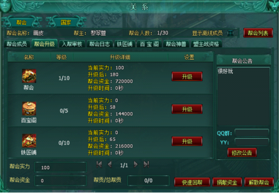 每个帮会中都有百宝阁和铁匠铺2种设施。
