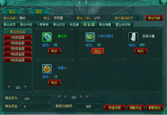 百宝阁:帮会的正式成员可在百宝阁中,使用帮贡购买其中的物品,百宝阁的等级越高,可购买的物品越多。