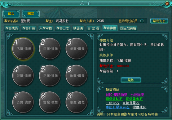帮会神兽:帮主或者副帮主通过一定的帮会资金开启帮会神兽,帮内玩家可以进入击杀神兽,神兽掉落封印紫装、升星幸运石等珍稀道具。