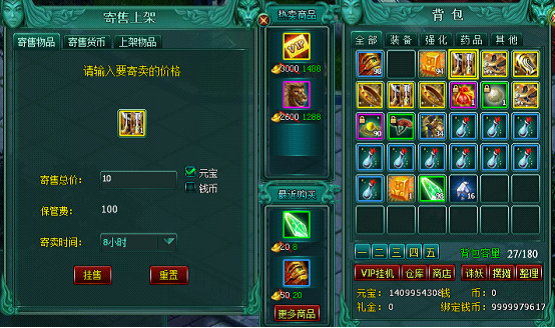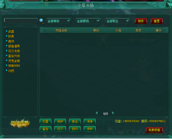 进入面板后可以搜索你想要的装备或者材料,如果想要自己买东西的话可以点击我要寄售,然后就进入以下的画面。可以把装备换成元宝或者钱币,注意这里要交一定的保管费的。