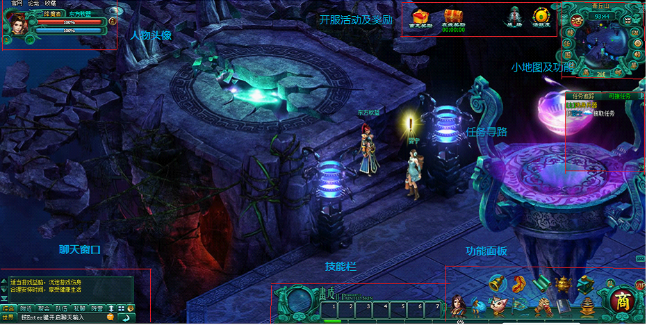 雷达区显示所在线路、所在的地图名称、怪物分布、人物当前坐标。显示活动、挂机设置、任务详细信息、战场信息查询、地图、离线挂机系统、邮件系统。