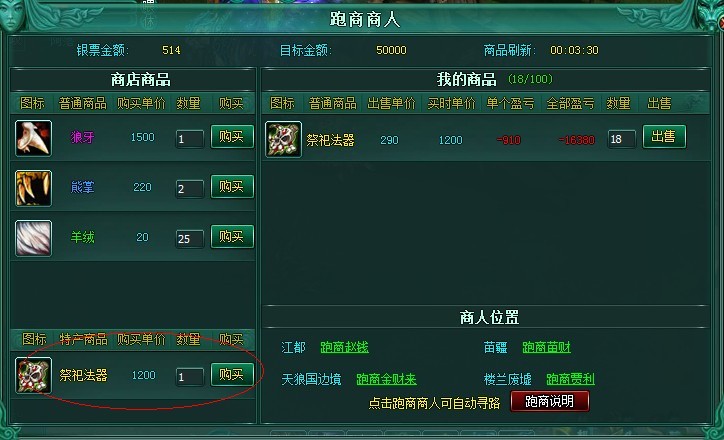 在接到跑商的任务的时候,老头肯定和你讲的一句话就是,要是遇见特产,一定要买下来!因为那是稳赚不赔的买卖,没错,不管是四个商人中的哪一个,只要出现了特产,都必然是低价买入高价卖出,如此一来,就可以大大的减少我们跑路的时间,是不是很划算呢?