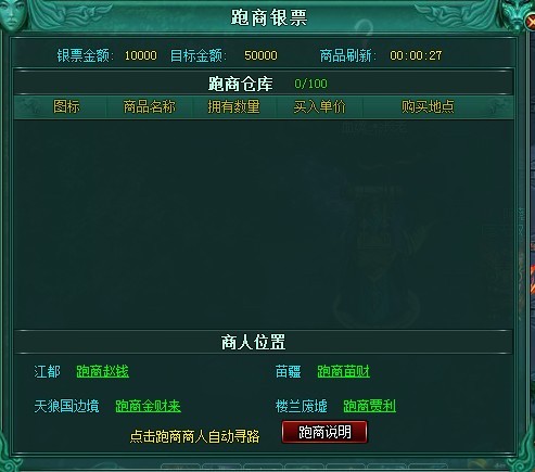 首先第一个,当然是关于“运费”的,有的玩家可能会很奇怪,何为运费?通过下面的图我们是可以看到的,跑商一共是有4个地方,点击就可以自动寻路过去的,这里的间隔路途可是非常非常的遥远的,有坐骑的情况下都要跑个半死,更别说没有的情况下,所以,这里是建议各位可以根据自己的情况选择,比如个人的运气开始是选择了第一个,那么当然就按照顺序从上到下,从左到右的跑,是我得出来最省力的办法,当然,是在不考虑出特殊情况的情况下,那么,特殊情况是指的是什么情况呢?