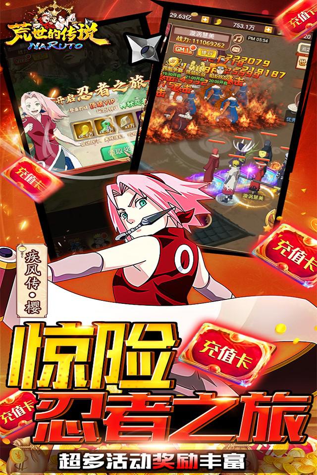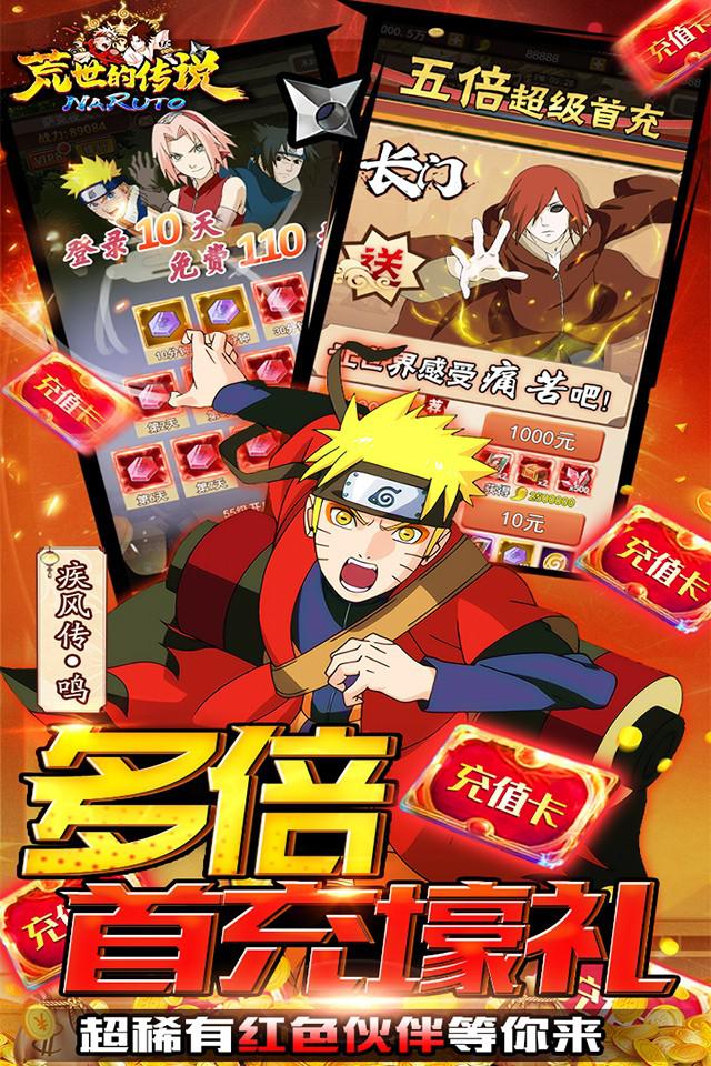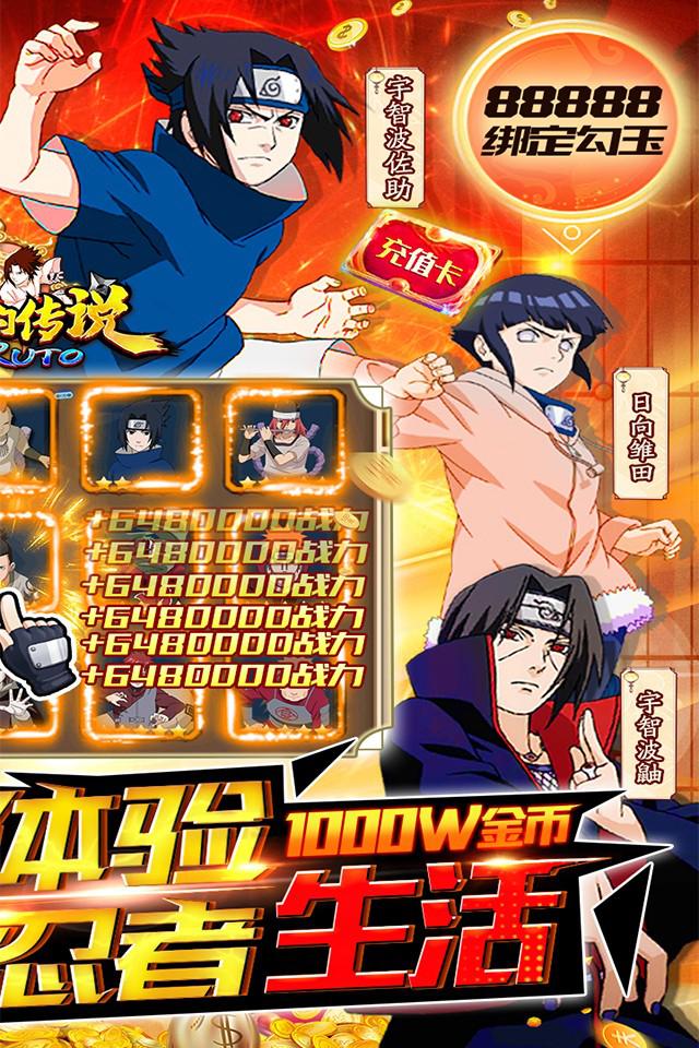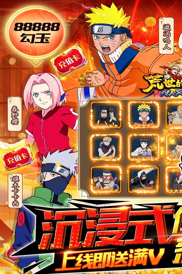 上线即送满V, 赠送88888勾玉,88888绑定勾玉,1000w金币!这是一款由经典题材《火影忍者》为原型打造即时卡牌手游,游戏为玩家呈现了一个真实的火影开放世界,玩家能以亲历者的身份,参与到火影恢宏浩大的冒险故事中来。自由探寻火影大世界的各个角落,接取任务挑战,沉浸式体验忍者生活,重温经典IP回忆。与鸣人小樱等角色一起,使用经典忍术大招,来一场刺激畅快的忍者战斗。更有数不尽的奇遇冒险等待成为忍者的你来探索。忍者们,向火影世界出发吧!