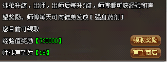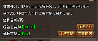 您可以在我要拜师面板中点击领取奖励按钮领取经验奖励;点击领取声望按钮领取声望奖励;点击声望商店将打开声望商店界面,在该界面中可以兑换奖励、查看当前所拥有的声望积分。