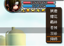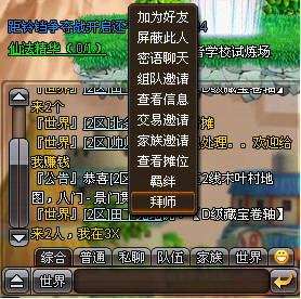 3.您也可以在聊天窗口中选择可以成为师傅的玩家,左键单机该玩家名字后,可以选择拜师选项(若对方不满足可收徒师傅时,将不出现拜师选项),发送拜师请求;