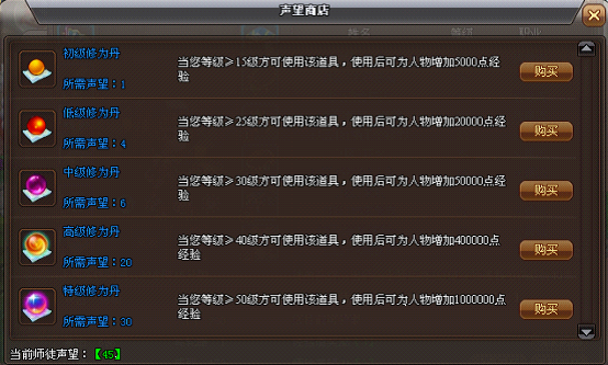 2.徒弟在出师前,等级每达到5的倍数,将可获得一定的经验与声望(获得经验和声望的数目将随着等级的增加而有所不同);出师后将无法获得该奖励;