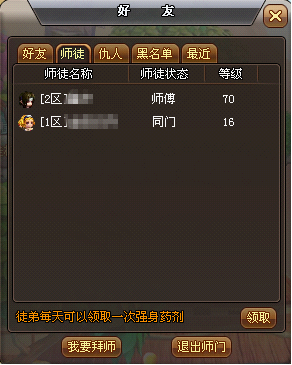 注:如果徒弟自动退出师门或者师傅主动将徒弟驱逐出师门,双方未领取的师徒奖励将被清零(师傅只清零该徒弟的)。