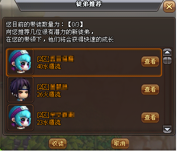 1.推荐徒弟:当您达到收徒条件还未有徒弟时,您每天第一次上线,系统会自动弹出推荐徒弟提示,点击后,可打开徒弟推荐窗口,选中想要收徒的对象,点击【收徒】按钮,将会向对方发送收徒申请。