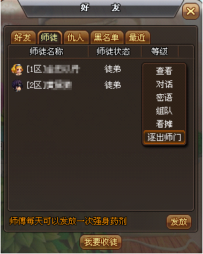 徒弟:徒弟只需在好友面板中的师徒选项卡内,点击推出师门按钮,即可成功退出师门。