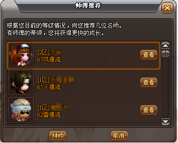 1.推荐拜师:当您达到拜师条件且未有师傅时,您每天第一次上线,系统会自动弹出推荐拜师提示,点击后,可打开师傅推荐窗口,选中想要拜师的对象,点击【拜师】按钮,将会向对方发送拜师申请。