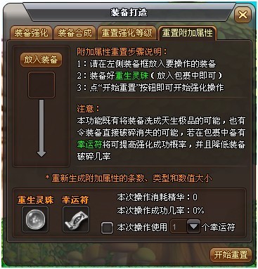 对装备的附加属性不满意时,可以通过重置附加属性的操作随机改变装备的附加属性,重置附加属性操作的话装备颜色等级将会下降,可在进行操作时放入幸运符增加装备属性的重置成功率。