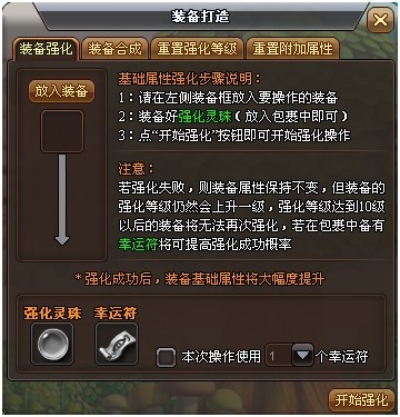 将需要进行强化操作的装备放置于装备强化界面的装备栏内,单击开始强化的按钮,如果此时背包内有强化灵珠,则会进行强化操作。