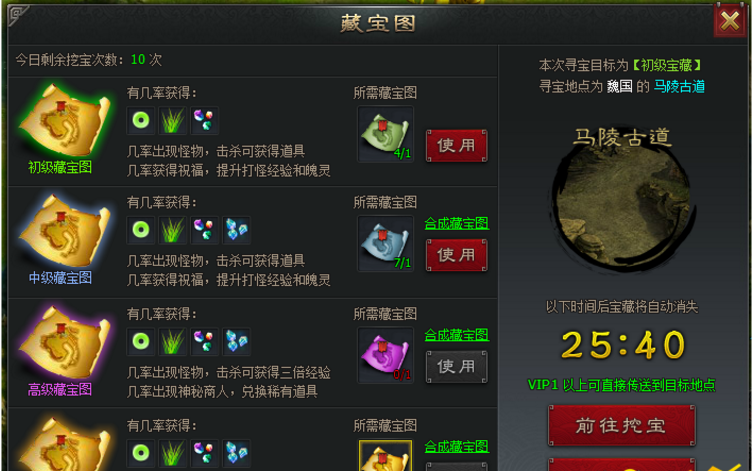 江湖中的藏宝图一共分为,初级藏宝图、中级藏宝图、高级藏宝图和特级藏宝图,使用不同的藏宝图获得的宝藏数量也不一样。玩家挖掘出宝藏之后会有一定几率获得材料,也有几率出现怪物,击杀可以获得道具,还有记录获得祝福,提升打怪经验和魄灵。玩家获得藏宝图的方式有很多种,参与副本和游戏中的活动都能获得,但是想要获得高等级的藏宝图就需要玩家对低等级的藏宝图进行合成,合成藏宝图需要10张低等级的藏宝图才能够获得一张高等级的藏宝图。玩家使用藏宝图之后将会给玩家一个宝藏的埋藏地点,玩家需要在30分钟之内前往目标地点并且成功挖掘宝藏,如果玩家没能在规定时间内挖掘宝藏,宝藏将会消失。宝藏地点会随机出现在游戏的任何一个地方,VIP1以上的玩家可以直接传送到目标地点。普通玩家也可以点击前往挖宝自动寻路到藏宝地点。如果玩家觉得宝藏不满意的话也可以点击放弃。