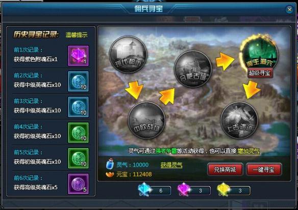 佣兵的获取现在只能采取兑换的方式,兑换不同品质的佣兵需要对应的佣兵碎片,佣兵碎片可以通过英魂石在佣兵商店中进行兑换。那英魂石又从哪里来呢?很简单,英魂石玩家可以通过佣兵寻宝获取,佣兵寻宝一共包括5个场景,其中魔王洞穴可以通过超级寻宝花费200元宝进行,其他寻宝则需要耗费灵气。