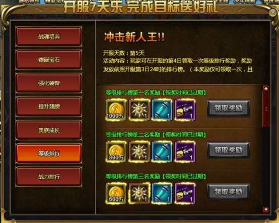 开服七天乐也是新人一定要参加的活动。开服的前7天会根据玩家对目标任务的完成情况进行奖励,包括海量的金币、潜能、声望以及时装。