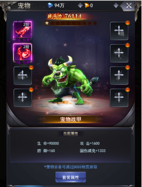 玩法:地宫击杀BOSS掉落宠物装备,多余的宠物装备则可分解成宠物内丹用于升级系统