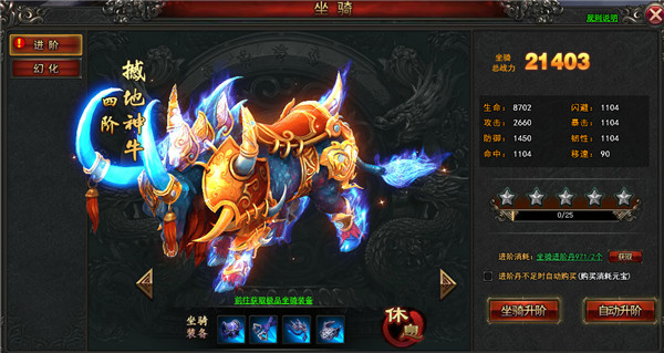 装备:坐骑达到指定阶数后,可穿戴坐骑装备,提升坐骑属性。