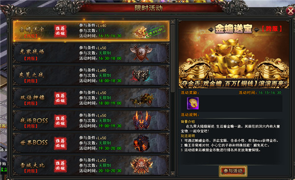 在九幽大陆的神秘处,生活着金蟾一族,其居住的洞穴内有大量宝物,参与夺宝可获得大量铜钱奖励。