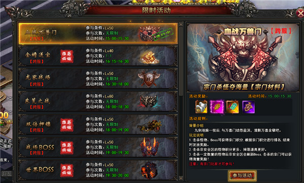 游戏内面向宗门成员的限定活动,根据战斗积分进行排名,排名靠前的玩家可获得丰厚奖励。