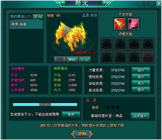 玩家可选择先进阶坐骑在提升品质或资质,也可以先提升品质或资质再进阶坐骑,品质提升会在一定范围内随机提升资质,进阶坐骑的同时可提升宠物资质的上限,玩家可根据个人喜好进行选择。