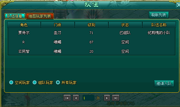 地图玩家列表是显示在人物所在的地图的玩家信息,可以查到未组队的玩家,和已经组队的玩家信息。可以对这些玩家进行邀请和申请进入已有的队伍中去。