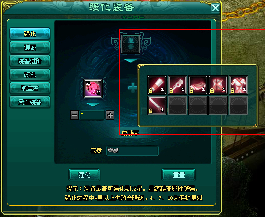 单一的强化石头成功率没有2个高级强化石成功率高,装备强化成功,会增加装备的品级,若装备强化失败,会把掉装备品级,而装备在4品,7品,10品为保护阶段,强化到7品以上的装备会绑定,绑定的装备不能进行交易。