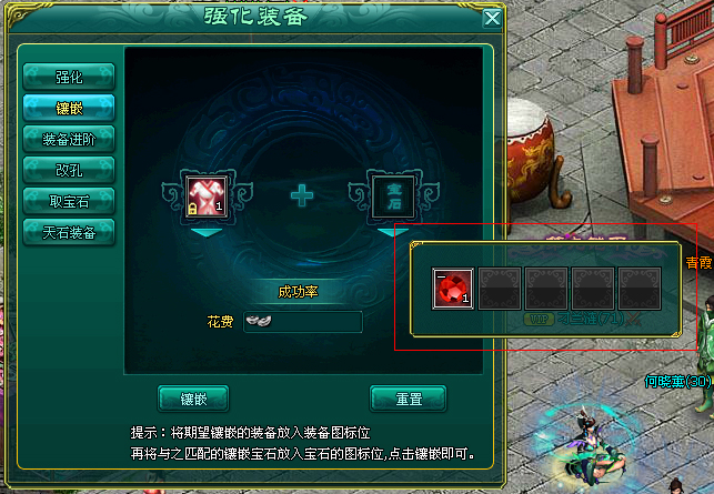 玩家可以把相应宝石镶嵌到对应的装备空中,镶嵌成功率为100%,