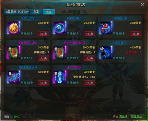 获得的荣誉可以到荣誉商店兑换坐骑碎片、神翼碎片和神器碎片,存荣誉冲排名,获取强力神器。