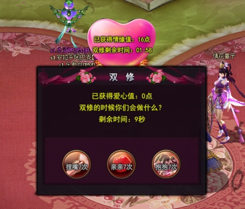 2. 双修期间可以不断获得情缘值,同事每隔12秒会有一个问题,双方选择相同的选项即可,选对可以获得额外奖励。