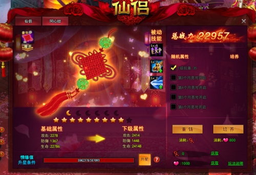 1. 同心结可以给玩家增加属性,当夫妻双方的情缘值越高,同心结的星级属性就会越强。