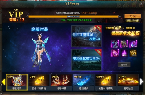 只要在游戏中消费元宝(与玩家交易不算),即可获得VIP成长值,成长值越高,对应的VIP越高。 入口在主界面左上角人物头像处,可随时查看自己的VIP等级和成长值。
